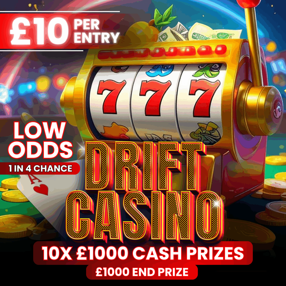 DRIFT CASINO LOW ODDS ONLY 3000 TICKETS 10 X £1000 INSTANT PRIZES + 1K END PRIZE